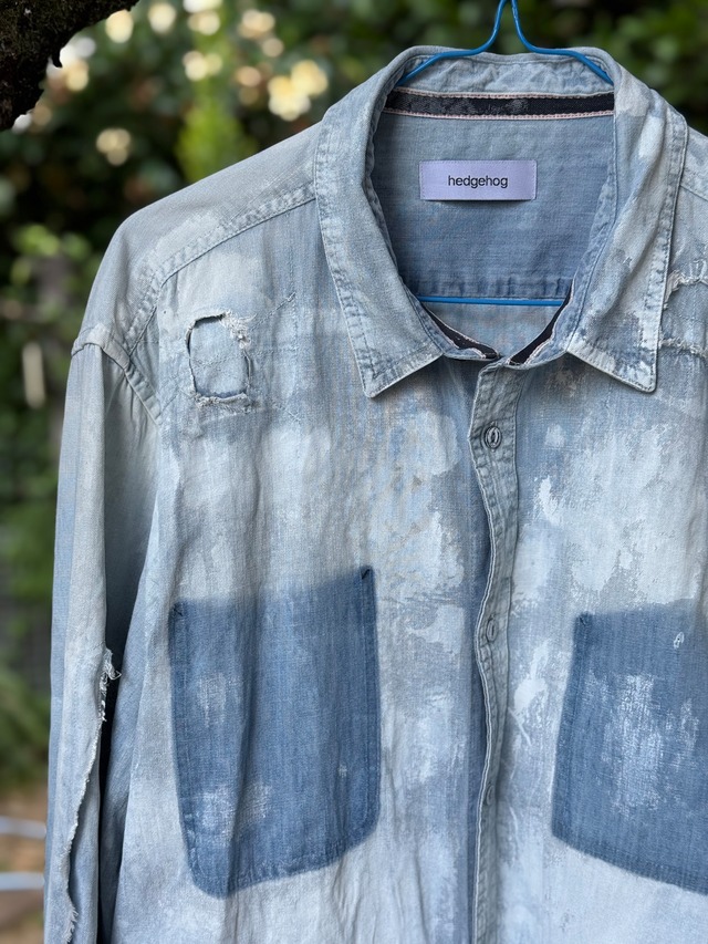 【サイズ】Fサイズ (平置き採寸) ・肩幅:51cm ・身幅:64cm ・袖丈:69cm ・着丈:82cm ※採寸は手作業のため、若干の誤差がある場合がございます。 【素材】 コットン100% 【カラー】 サックスブルー ※撮影環境やモニター設定により、実際の色味と若干異なる場合がございます。 【商品説明】 薄手のシャンブレーデニムシャツに大胆なリペアを入れて、さらにローラーペイントを施し、最後に胸ポケットを取り外しアクセントにしたシャツ。 かなり薄くローラーペイントしていますが、、、着たり洗ううちに馴染みますが、想定より左腕だけが少し硬くなってます…m(_ _)m 大失敗までは行ってないですが、これくらいのたまにの失敗もリメイクの醍醐味と思っていただけたら幸いです…。 しかし!ツラ感などは非常によく、秋口や夏の腰巻きスタイルなどにぜひ使って欲しい一枚です。 こちらは、古着を使用してリメイクした一点物のトップスです。使用しているアイテムはすべて正規に購入した古着であり、リメイク後のデザイン・加工は当ブランドが一点一点手作業で行っております。 古物営業法および商標法に則り、リメイク販売可能な範囲内で制作しており、元のブランドとの提携・コラボレーション商品ではございませんので、あらかじめご了承ください。 リメイク品のため、既製品のような完璧さをお求めの方は購入をご遠慮ください。古着由来のダメージや使用感(色褪せ・毛羽立ち・小さな汚れなど)がある場合もございます。ご理解のうえご購入をお願いいたします。 【お手入れについて】 リメイク加工を施しているため、洗濯はできるだけ手洗いまたはネット使用の上、優しくお取り扱いください。 【返品・交換について】 原則として、イメージ違いやサイズ違いによる返品・交換は受け付けておりません。気になる点がございましたら、ご購入前にお気軽にお問い合わせください。