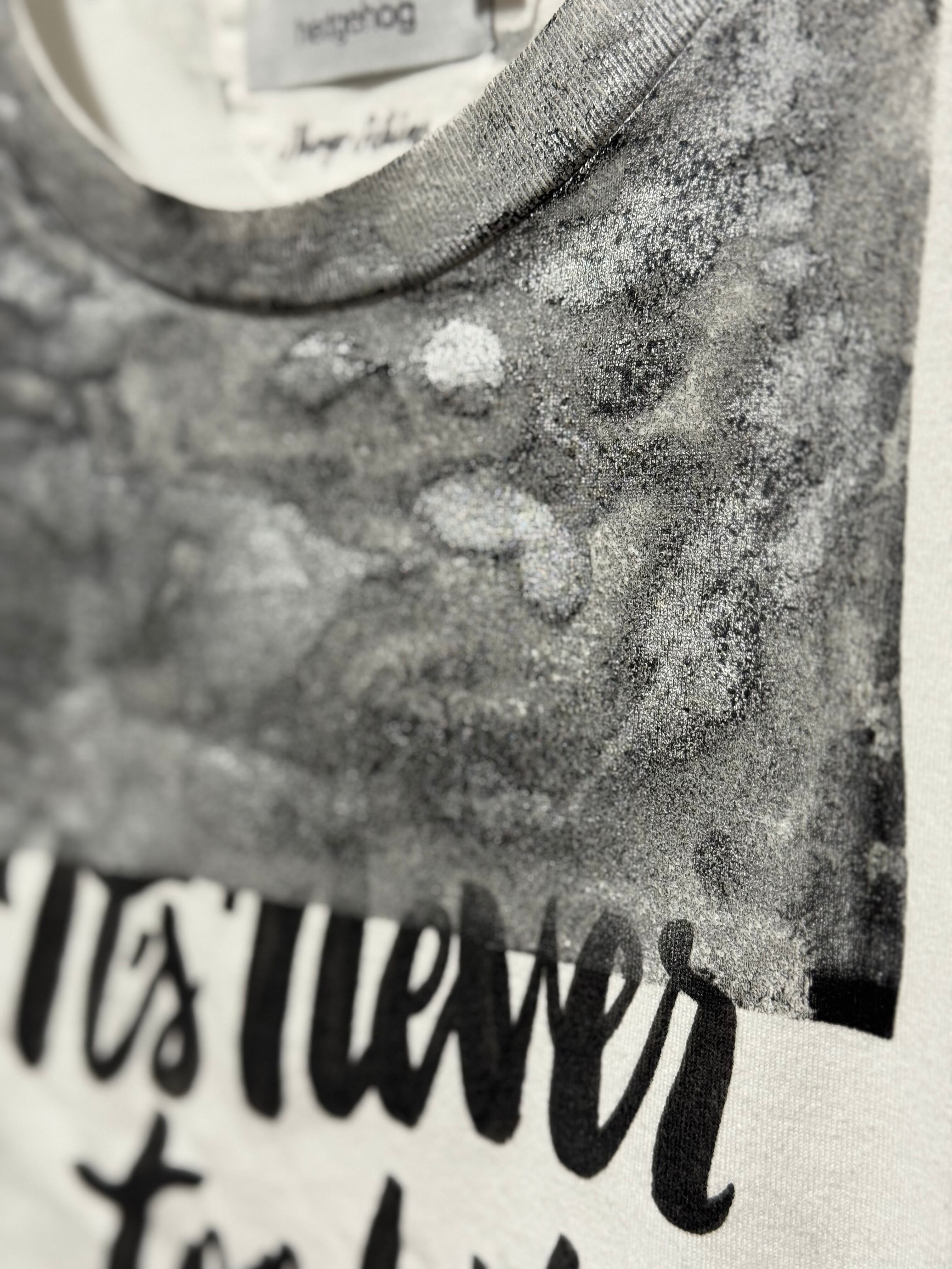 黒のペンキで四角くマスキングしてローラーペイントを施してから、その黒の上に2種類のシルバーの塗料を乗せた箔プリントのようなリメイク。