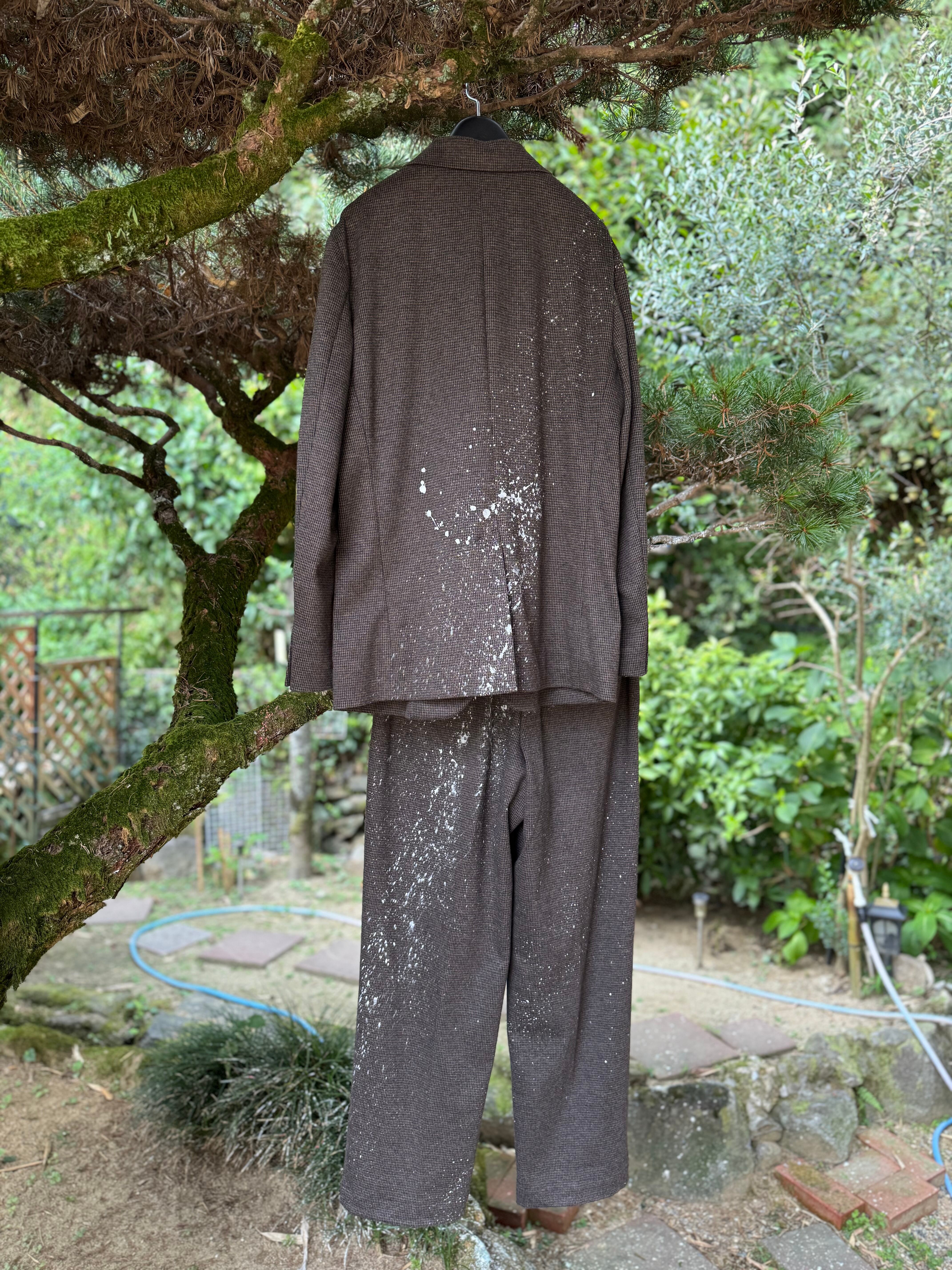 右脚上側にビンテージワッペン、左脚背面に斜めにペンキのスプラッシュ。
