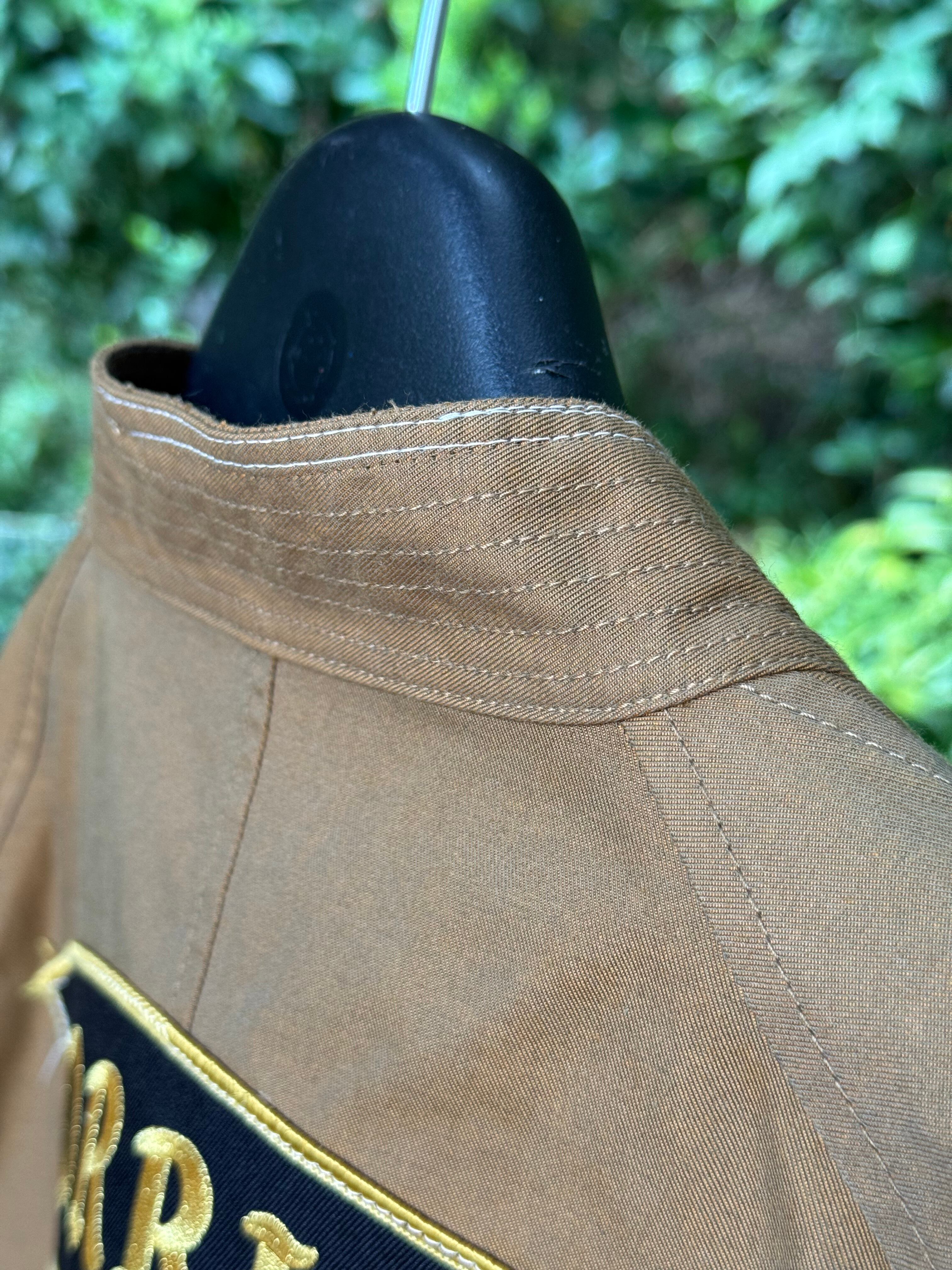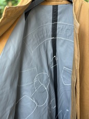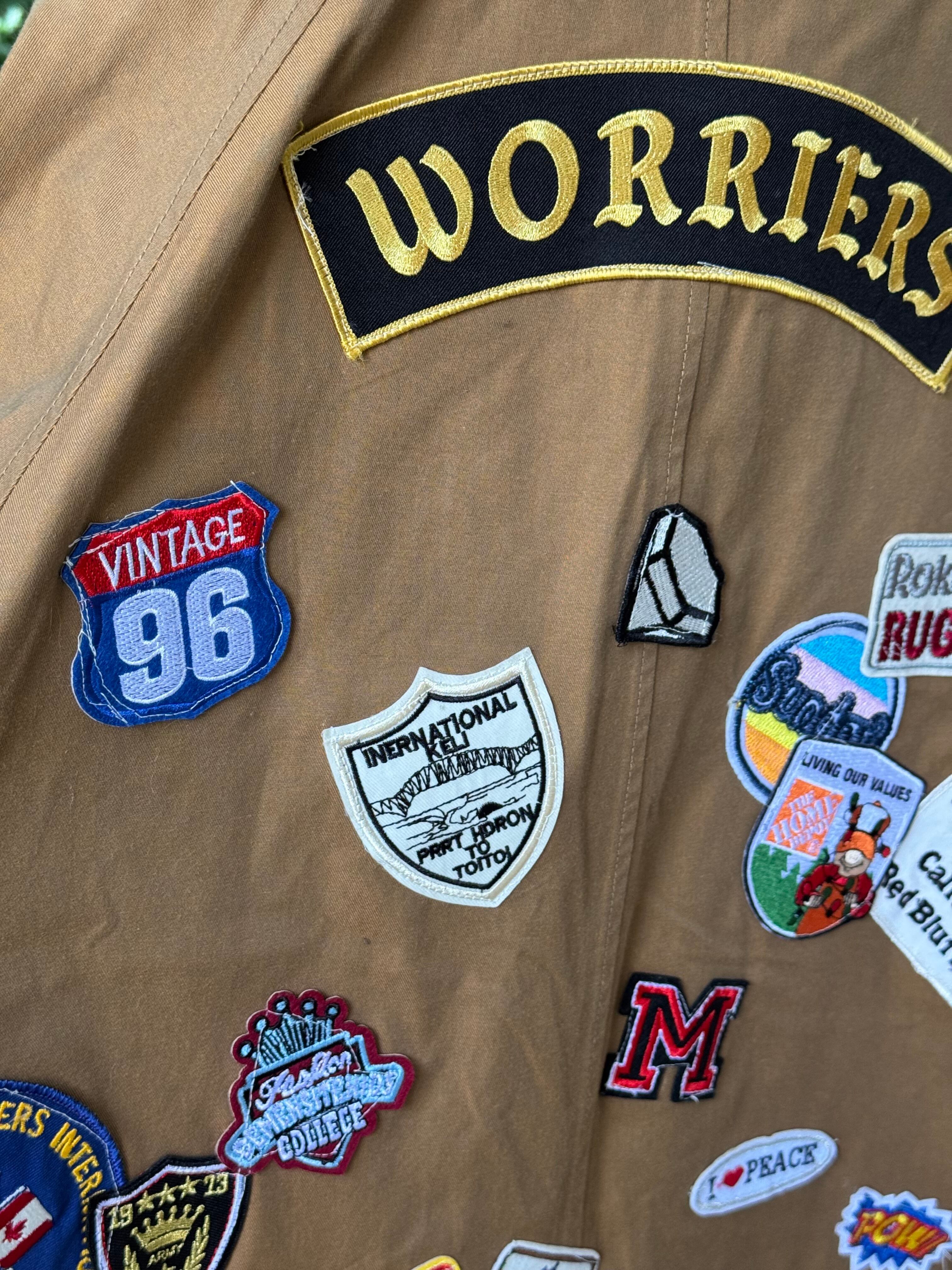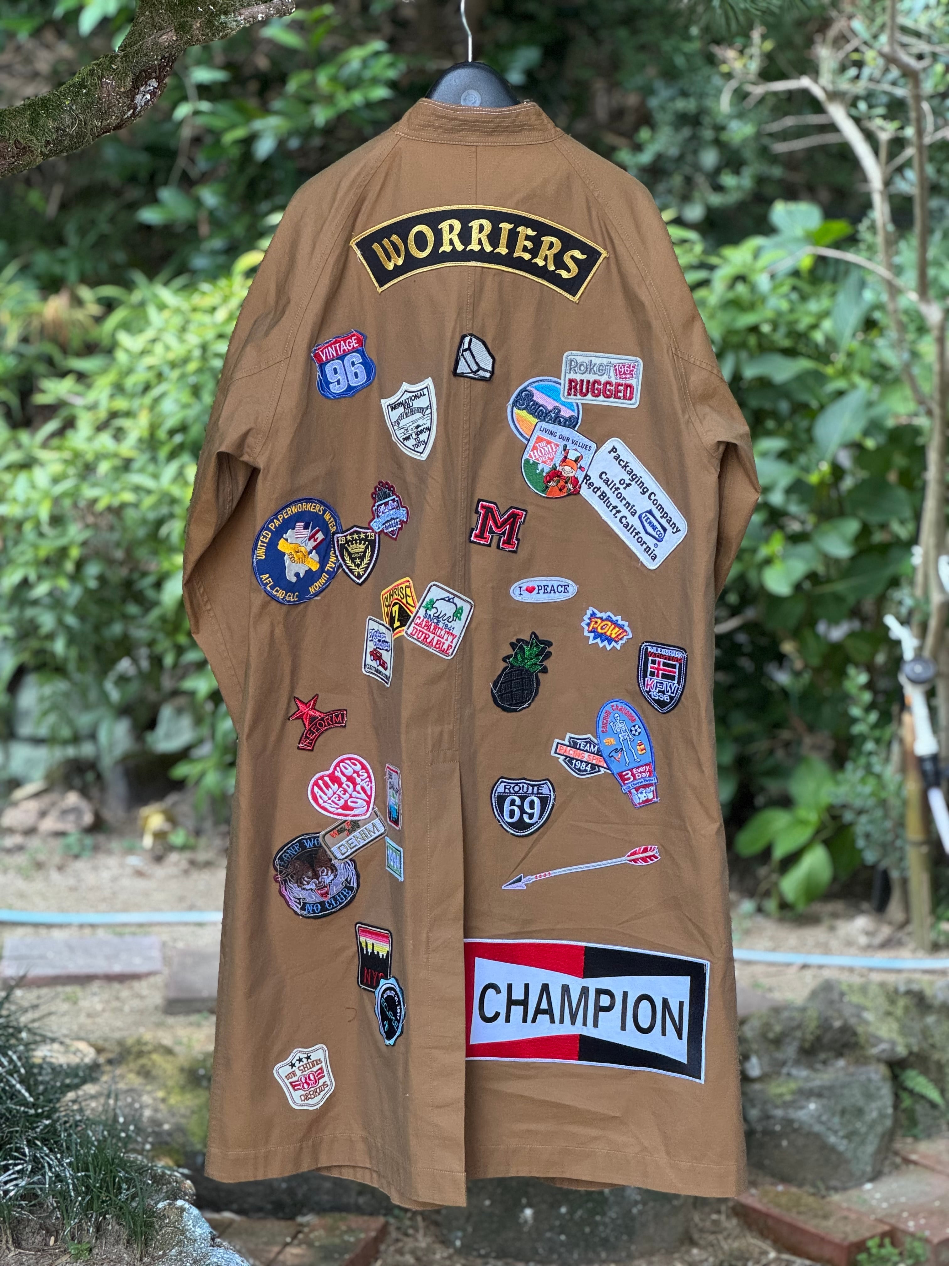 もともとはステンカラーコートだった物をスタンドカラーコートに変更。そして背中一面にヴィンテージ(一部現行もあったかも?)のワッペンを貼り巡らせ、さらにしっかりとミシンでひとつひとつ縫い付け改修しました。